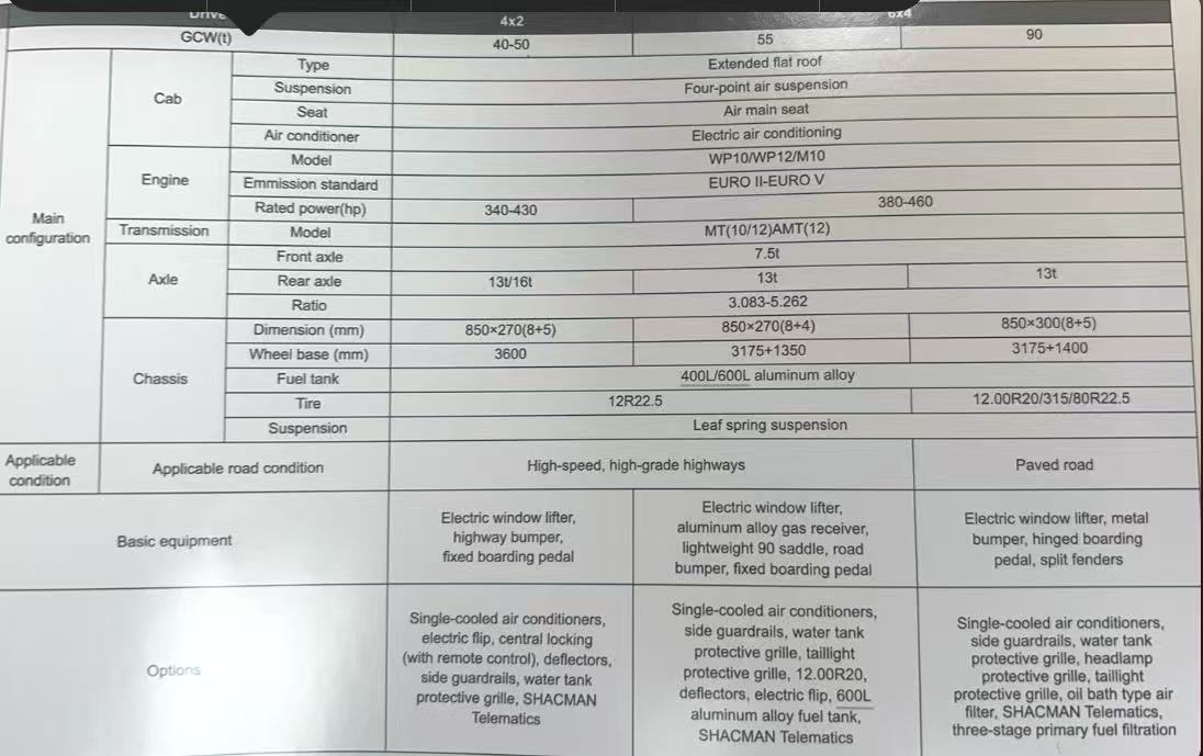 - 車軸とサスペンション:フロントアクスルはMAN 9.5Tテクノロジーを採用し、リアアクスルは13Tまたは16Tマン車軸を採用します。サスペンションシステムは、高強度のスチールプレートスプリングを採用しています。これは、重い負荷の影響に耐え、複雑な道路状況下でトラックの安定性と耐久性を確保することができます。